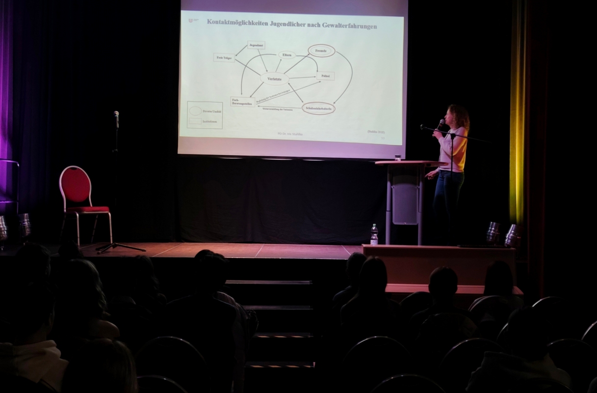 Der erste Vortrag fand für den 13. Jahrgang statt: "Gewalt in Teenagerbeziehungen", gehalten von Frau PD Iris Stahlke (siehe Fotos).