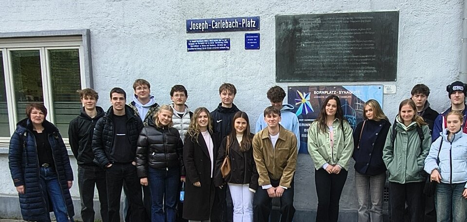 Im Rahmen des aktuellen Semesterthemas "Jüdisches Leben in Deutschland" haben die Geschichts-Leistungskurse von Frau Beermann und Herrn Dr. Plath (Jg. 12) eine Exkursion nach Hamburg unternommen. Im Rahmen einer zweistündigen Führung durch das Grindelviertel erfuhren wir, dass in diesem Stadtteil bis 1933 etwa 20.000 Juden wohnten. Die Führung startete an der erst 2002 wieder an die jüdische Gemeinde Hamburg zurückgegebene Talmund Tora Schule, die heute das Rabbinat beherbergt. Direkt daneben befindet sich in Gedenken an den von den Nationalsozialisten deportierten und ermordeten Rabbiner Joseph Carlebach der gleichnamige Platz, wo bis 1938 die Synagoge stand. Diese wurde aufgrund der engen Bebauung im November 1938 nur symbolisch angezündet und von den Nationalsozialisten abgetragen. Am Rand des Platzes errichteten sie einen Bunker, der dem geplanten Wiederaufbau der Synagoge weichen soll.