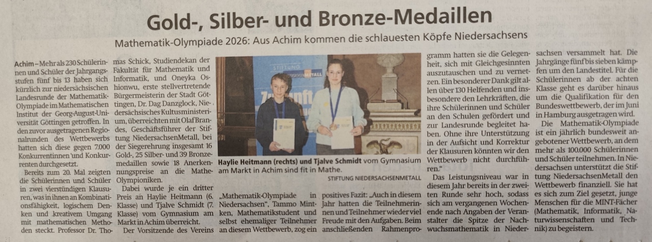 Wir gratulieren allen Teilnehmenden herzlich zu diesem großartigen Erfolg und danken ihnen dafür, dass sie unsere Schule so engagiert und erfolgreich vertreten haben! Unten ein Artikel aus dem Achimer Kreisblatt vom 4.3.2026.