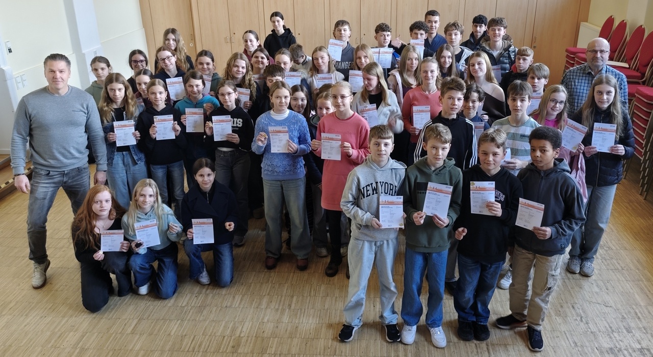 Seit weit über zehn Jahren kooperieren der TSV Achim und das GamMa (Teamleitung: H. Behm) beim Sportabzeichen. Jeweils die kompletten Jahrgänge fünf bis acht nehmen teil, Abnahme und Organisation übernimmt der TSV Achim. Im letzten Durchgang gab es 74 Gold-Urkunden, das sind 40 mehr als 2025. In einer großen Pause überreichte Wilfried Schmidt den erfolgreichsten Schülerinnen und Schüler das Sportabzeichen in „Gold“, Schulleiter Dirk Stelling und Gerrit Behm freuten sich über die stattliche Anzahl sportlich aktiver Menschen. Wie immer musste man nach Alter und Geschlecht unterschiedliche Mindestbedingungen in vier unterschiedlichen Disziplinen erfüllen, um das Sportabzeichen zu erlangen.