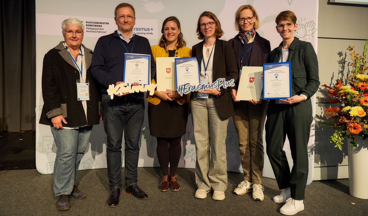 In der Kategorie ,,Success Stories“ mit dem Schwerpunktthema ,,Medienkompetenz und digitale Bildung“ gewann das GamMa bundesweit den zweiten Platz! Insgesamt 26 Schulen wurden in verschiedenen Schwerpunktthemen ausgezeichnet. Die Preisverleihung war in eine zweitägige Veranstaltung mit dem Titel ,,Best of Erasmus - Celebrating what unites us“ eingebettet, an welcher ca. 200 Lehrkräfte und Bildungsfachleute aus mehreren europäischen Staaten teilnahmen. Überreicht wurden die Urkunden innerhalb einer feierlichen Zeremonie von der Präsidentin der Bildungsministerkonferenz der KMK, Simone Oldenburg (1. Bild, ganz links; PAD/Marcus Gloger).