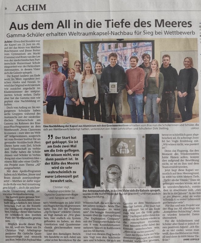 Als Dankeschön für unsere erfolgreiche Teilnahme beim Wettbewerb ,,From Classroom to Cosmos" (hier die ursprüngliche Meldung mit den Hintergrundinfos) haben wir nun eine Nachbildung "unserer" Kapsel bekommen, die im Weltraum war. Die Details gibt es im Achimer Kreisblatt zu lesen (Link zum Artikel vom 14.10.2025):