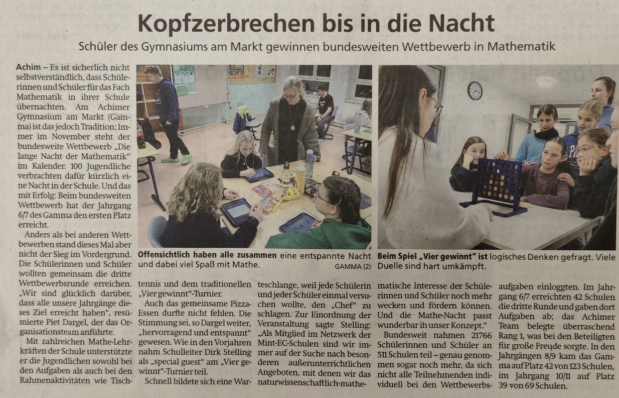 Natürlich haben wir auch in diesem Jahr an der "Langen Nacht der Mathematik" teilgenommen. Wir - das sind 100 (!) Schülerinnen und Schüler der Jahrgänge 6 bis 13, die in der Schule übernachtet haben (mehr konnten wir nicht annehmen). Und fast die komplette Gruppe der Mathe-Lehrkräfte (inklusive Referendare), die sich unterstützend eingebracht hat. Stellvertretend für alle Helfer geht der Dank an Orga-Chef Piet Dargel, doch auch viele andere Lehrkräfte waren organisierend oder "anpackend" dabei.