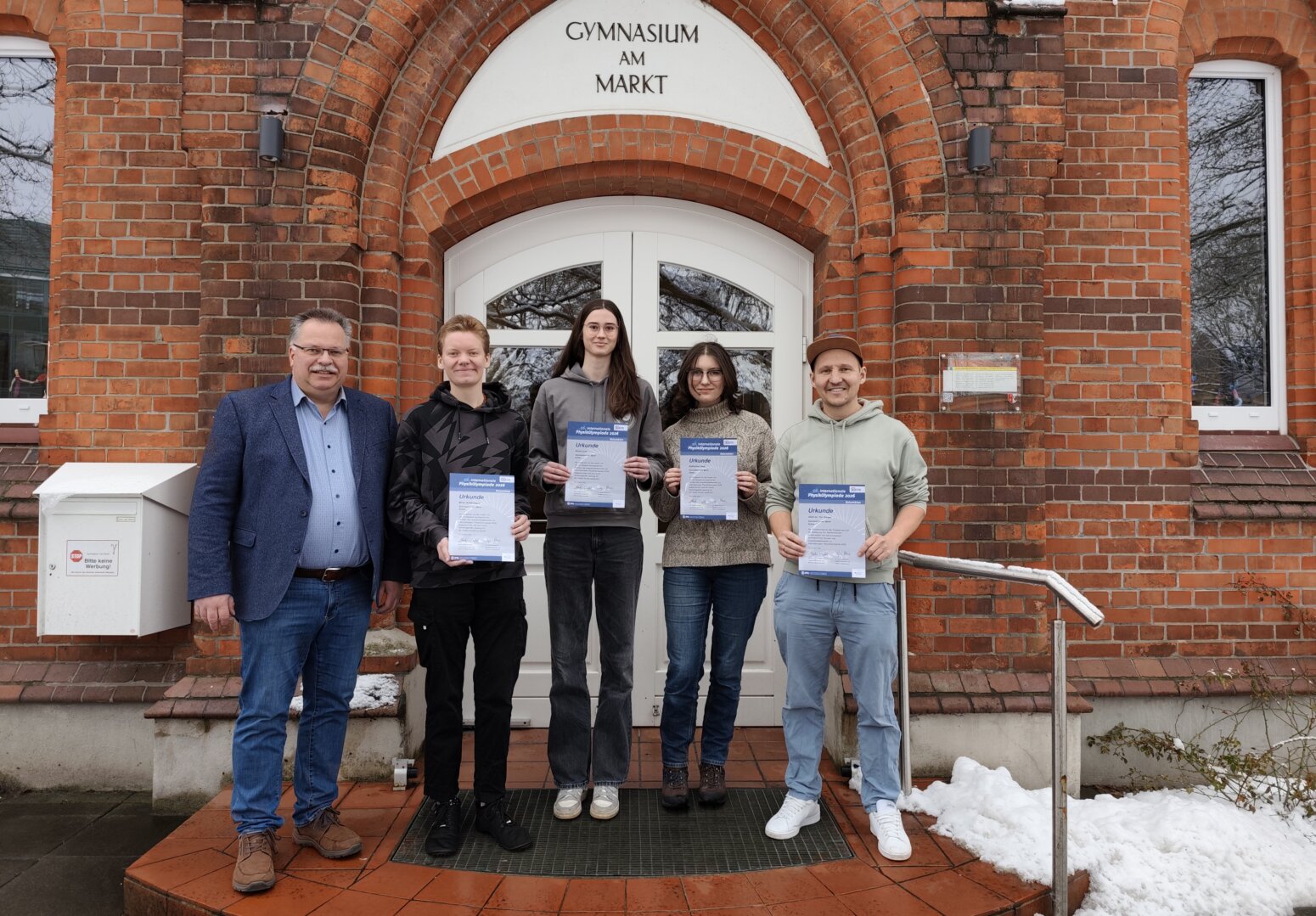 Auch in diesem Schuljahr haben wir an der "Internationalen PhysikOlympiade" (ja, die schreibt sich so komisch) teilgenommen. Mina Holtermanns, Anna Lusts und Katharina Grebs Leistungen reichten für die Qualifikation zur 2. Runde aus - Glückwunsch! Es freuen sich darüber auch Dr. Piet Dargel als Fachvertreter Physik und Dirk Stelling als Schulleiter.