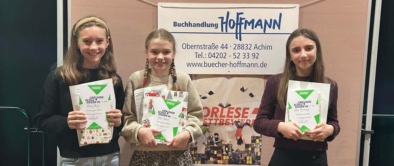 Herzlichen Glückwunsch an unsere Schulsieger/innen des Jahres 2025! Wir freuen uns, dass alle Sechstklässler/innen so toll am Vorlesewettbewerb mitgewirkt haben und dadurch auch die Gelegenheit bekommen haben, viele neue Jugendbücher kennen zu lernen. Nun drücken wir unserer Schulsiegerin Jule Schaal aus der 6b die Daumen, wenn sie für das GamMa beim Kreisentscheid in Verden antritt!